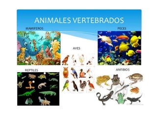 Este documento describe las características comunes de los seres vivos como nacer, desarrollarse, alimentarse, requerir ciertas condiciones ambientales y reproducirse. Luego explica que los seres vivos se pueden clasificar en grupos de acuerdo a sus características similares, como los vertebrados que tienen columna vertebral y esqueleto óseo, o los invertebrados que carecen de columna vertebral y esqueleto óseo. Finalmente, proporciona ejemplos de animales vertebrados como el canguro y