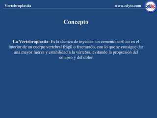 La vertebroplastia es una técnica en la que se inyecta cemento acrílico en el interior de una vértebra frágil o fracturada para fortalecerla y reducir el dolor. Se ha utilizado desde 1960 para cirugía de cadera y desde 1987 para tratar fracturas vertebrales. La vertebroplastia se usa para fracturas vertebrales osteoporóticas de 3 a 4 meses que no responden a otros tratamientos para diferenciar tipos de fracturas y conocer indicaciones y posibles complicaciones.