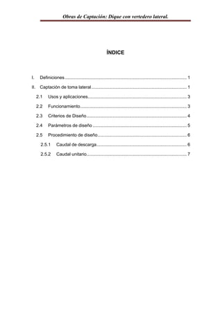 Este documento describe el diseño de una obra de captación de agua superficial conocida como dique con vertedero lateral. Explica que consiste en una estructura de concreto con una caja y un vertedero lateral ubicado en el flanco de un curso de agua para captar el agua de manera directa. Luego detalla los componentes, criterios de diseño, parámetros a considerar y el procedimiento para calcular el caudal de descarga a través del vertedero.