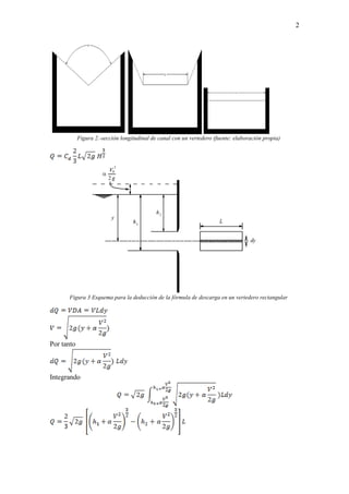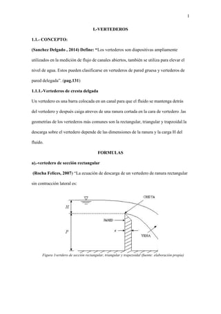 Este documento describe diferentes tipos de vertederos utilizados para medir y controlar el flujo de agua en canales abiertos. Explica las fórmulas para calcular el caudal a través de vertederos rectangulares, triangulares y trapezoidales, incluyendo factores como la geometría, carga de agua y coeficientes de descarga. También cubre métodos para vertederos de pared gruesa, sumergidos y controlados por compuertas. El documento proporciona una referencia detallada de las fórmulas y mé