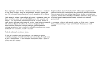 El documento describe la práctica del "flujo vertical central", que consiste en colocar los dedos en nueve puntos de presión a lo largo de la línea central del cuerpo durante 2-3 minutos cada uno para estimular el flujo de energía vital a través de los chakras. La práctica diaria de este ejercicio puede aliviar varios problemas de salud y proporcionar un sentido de armonía y bienestar.