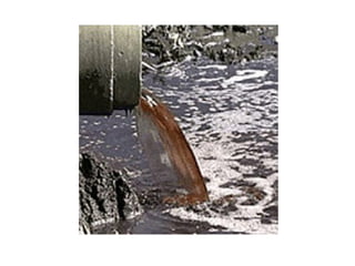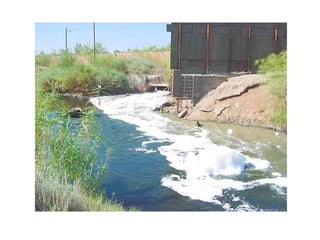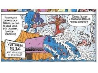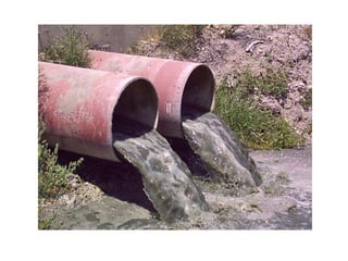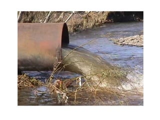 El documento habla sobre la contaminación del agua debido a vertidos continuos. Muestra imágenes de cómo la acción humana está afectando negativamente el agua. Incluso personas prominentes se ven afectadas por la crisis del agua.