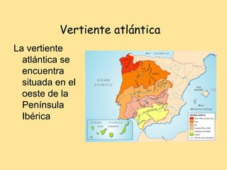 Este documento describe 10 ríos de la vertiente atlántica de la Península Ibérica: Miño, Tambre, Duero, Pisuerga, Jarama, Tajo, Guadiana, Odiel, Tinto y Guadalquivir. Proporciona información sobre el origen, afluentes, longitud y desembocadura de cada río.