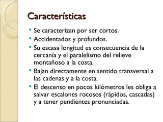 Este documento describe las características de los ríos de la vertiente del Pacífico de Costa Rica. Menciona que estos ríos son cortos, accidentados y profundos debido a la cercanía de las montañas a la costa. Lista los principales ríos como el Tempisque, Grande de Tárcoles, Pirrís o Parrita, Grande de Térraba y Coto Colorado. Brevemente describe cada uno y su importancia para la agricultura y la generación de energía.