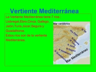 La Vertiente Mediterránea tiene 7 ríos principales: Llobregat, Ebro, Cinca, Gallego, Jalón, Turia, Júcar, Segura y Guadalhorce. Se sitúa en el norte peninsular y sus ríos son cortos, poco caudalosos y muy irregulares, excepto el Ebro y el Gallego.