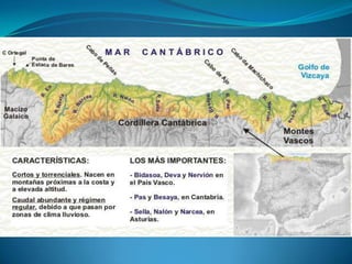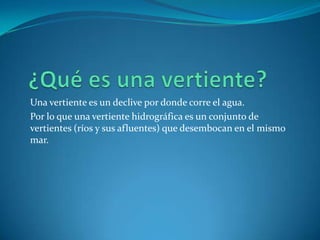 Hay tres vertientes hidrográficas principales en España: la Vertiente Cantábrica, la Vertiente Atlántica y la Vertiente Mediterránea. La Vertiente Cantábrica se caracteriza por ríos cortos y caudalosos debido a las fuertes lluvias. La Vertiente Atlántica incluye los grandes ríos de la Meseta como el Duero y el Tajo. La Vertiente Mediterránea tiene ríos más pequeños e irregulares debido a la aridez, excepto el Ebro que es el más caudaloso.