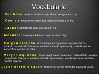 El documento presenta las principales vertientes y ríos de España. Describe las tres vertientes del país - Atlántica, Cantábrica y Mediterránea - y lista los principales ríos de cada una. Incluye vocabulario clave sobre conceptos hidrológicos como vertiente, cuenca, caudal, meandro y margen. Finalmente, enumera los mayores ríos españoles como el Ebro, Duero, Tajo y Guadalquivir.