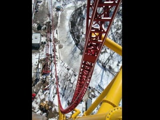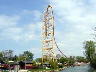 El documento presenta información sobre la montaña rusa Top Thrill Dragster, localizada en Cedar Point, Ohio, EE.UU. Se inauguró en 2003 y es la montaña rusa más rápida del mundo, alcanzando una velocidad máxima de 193 km/h en menos de 4 segundos sobre un recorrido de 853 metros de largo y 128 metros de altura.