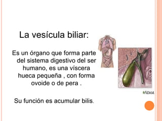 La vesícula biliar forma parte del sistema digestivo y almacena bilis producida por el hígado. Se desarrolla a partir del intestino embrionario y permanece sólida hasta la duodécima semana. Está ubicada en la unión del lóbulo derecho e izquierdo del hígado. La bilis ayuda a digerir grasas y absorber vitaminas.