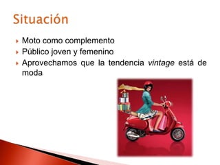 La publicidad promueve una Vespa como un complemento de moda para mujeres jóvenes, aprovechando la tendencia vintage. Sugieren que una moto, al igual que otros accesorios como bolsos o zapatos, puede ser una forma de expresión de la identidad de una mujer.