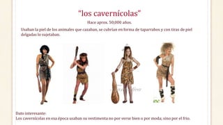 El documento resume la evolución de la vestimenta femenina a través de los tiempos, desde la prehistoria hasta el siglo XXI. Comienza describiendo la vestimenta de las mujeres en la prehistoria, la antigüedad clásica y la Edad Media, cuando usaban pieles de animales y telas como el lino y la lana. Luego describe los cambios en la vestimenta a través de la Edad Moderna, los siglos XVIII al XX, cuando se adoptaron prendas como el corsé, la falda y el pantalón, así como la influencia