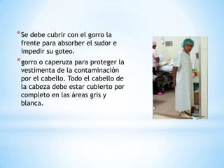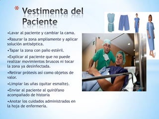 El documento proporciona instrucciones para preparar a un paciente para una cirugía, que incluyen lavar al paciente, rasurar y desinfectar el área quirúrgica, explicarle al paciente que no debe hacer movimientos bruscos, retirar prótesis y objetos de valor, limpiar las uñas, y enviar al paciente al quirófano acompañado de su historia clínica, anotando los cuidados administrados. También da instrucciones para el lavado quirúrgico de manos y la vestimenta quirúrg