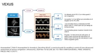 El documento presenta una guía práctica para la evaluación de la congestión venosa mediante ultrasonido en el punto de atención. Se definen diferentes grados de congestión basados en el diámetro de la vena cava inferior y en las anomalías observadas en el doppler. Los grados de congestión se clasifican del 0 al 3, donde el grado 3 indica congestión severa.