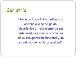 Este documento describe los principales conceptos e instrumentos de la geriatría. En resumen: (1) La geriatría se enfoca en el diagnóstico y tratamiento de enfermedades agudas y crónicas en ancianos, así como en la recuperación funcional y reinserción comunitaria. (2) Los instrumentos clave son la valoración integral multidimensional, el trabajo interdisciplinario y los diferentes niveles de atención. (3) La valoración integral evalúa las áreas clínicas, funcionales, mentales y sociales para identificar problemas y est