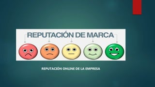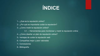 Este documento discute la importancia de la reputación en línea para las empresas. Explica que la reputación en línea se forma a través de factores internos y externos y cómo medirla usando herramientas como BuzzWatcher y Brandwatch. También describe cómo diseñar un plan de reputación para anticipar y analizar comentarios, e identifica algunas de las compañías con mejor y peor reputación como Lego, Disney, Uber y Facebook.