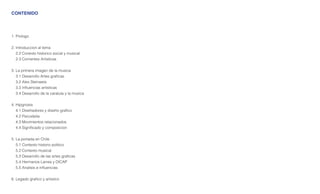Este documento presenta una propuesta para analizar la visualización de contenidos musicales a través de la historia de las portadas de discos. Comienza con una introducción al tema y al contexto histórico y musical. Luego describe el desarrollo de las primeras imágenes en portadas de música, incluyendo influencias artísticas y el crecimiento de la relación entre la música y su presentación visual. Más adelante analiza el estudio Hipgnosis y su impacto, así como el desarrollo paralelo de portadas en Chile, considerando fact