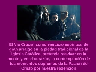 El Vía Crucis pretende reavivar la contemplación de los momentos de la Pasión de Cristo por nuestra redención a través de 14 estaciones que recuerdan los sufrimientos de Jesús desde el Huerto de los Olivos hasta su sepultura, ofreciendo una oración en cada estación para unirnos a su sacrificio redentor.
