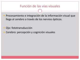 Las vías visuales transmiten la información visual del ojo al cerebro para su percepción y cognición. La retina proyecta al cuerpo geniculado lateral, colículo superior, núcleos del hipotálamo y sistema óptico accesorio. El cuerpo geniculado lateral organiza topográficamente la información para cada ojo y tipo de célula ganglionar antes de proyectar a la corteza visual. Los diferentes niveles de las vías visuales pueden dañarse causando defectos específicos en el campo visual como hemianopsias.