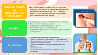 Este documento resume las vías de administración oral, sublingual, tópica dérmica y mucosa. Describe las ventajas e inconvenientes de cada vía, así como las formas farmacéuticas comúnmente usadas. La vía oral es la más fácil pero puede ser destruida en el estómago. La sublingual actúa rápido y evita el hígado. La tópica actúa localmente a través de la piel o mucosas.
