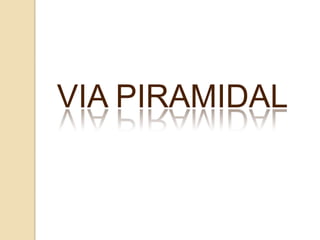 Este documento describe la vía piramidal y sus características. La vía piramidal transmite señales motoras desde la corteza motora hasta los músculos y consta de dos neuronas. La primera neurona se origina en la corteza motora y termina en la médula espinal, mientras que la segunda neurona conduce las señales desde la médula hasta los músculos. El documento explica las características de cada neurona y los diferentes haces que componen la vía piramidal.