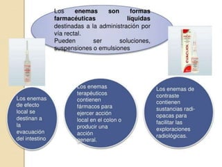 Este documento presenta una unidad didáctica sobre la administración de medicamentos dirigida a estudiantes de enfermería técnica. La unidad cubre temas como la administración de supositorios, enemas rectales y pomadas rectales. El documento lista los nombres de las estudiantes y la profesora a cargo del curso.