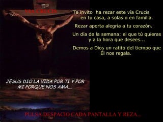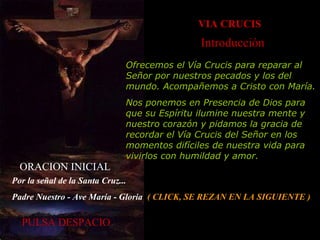 Este documento presenta un guión para rezar el Vía Crucis en 14 estaciones. Cada estación describe brevemente un evento de la Pasión de Cristo según los evangelios y ofrece una oración. El documento invita a rezar el Vía Crucis de forma privada o en familia para reparar los pecados y acompañar a Cristo en su sufrimiento.