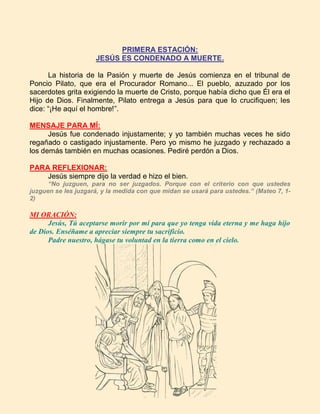 Este documento presenta un resumen del Vía Crucis para niños, con 11 estaciones que describen los sufrimientos de Jesús en su camino hacia el Calvario. Cada estación incluye un mensaje para los niños, una reflexión y una oración. El objetivo es enseñar a los niños sobre el sacrificio de Jesús y cómo pueden seguir su ejemplo de bondad y compasión hacia los demás.