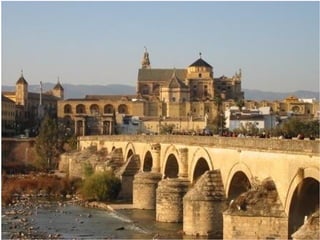 El documento resume la visita de un grupo escolar a Córdoba, describiendo brevemente algunos de los principales lugares históricos que visitaron, incluyendo la Mezquita/Catedral, el Alcázar de los Reyes Cristianos y la Judería. Relata cómo la Mezquita fue construida originalmente como un templo musulmán y luego convertido en una catedral cristiana. Explica que el Alcázar fue construido por orden del rey Alfonso XI y fue el lugar donde gobernaron los Reyes Católicos. Tamb