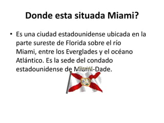 Este documento proporciona detalles sobre un viaje planificado a Miami, Florida, EE. UU., incluida la ubicación de Miami, las fechas y horas de los vuelos de ida y vuelta desde Mallorca con escalas en Madrid, los precios del vuelo y el hotel para dos personas durante 10 noches, y un breve resumen sobre el hotel seleccionado cerca del océano Atlántico.