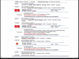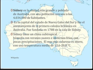 El documento proporciona información sobre un viaje planificado a Sídney, Australia. Se detalla que el viaje durará 12 días en enero, incluyendo visitas a atracciones como el zoo de Taronga, las Montañas Azules, la Ópera de Sídney y varias playas. También se alquilará un coche en el aeropuerto de Sídney y se pernoctará en el Hotel Samford Plaza por un total de $4,492 euros para los dos pasajeros.