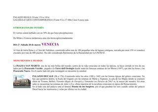Este documento presenta el itinerario de un viaje de estudios a Italia que incluye visitas a ciudades como Milán, Venecia, Pisa, Florencia. En cada ciudad, se describen los principales monumentos y museos a visitar, como la catedral de Milán, el Palacio Ducal y la Basílica de San Marcos en Venecia, la Torre Inclinada y el Campo de los Milagros en Pisa, y la Catedral, la Plaza de la Señoría y el Puente Vecchio en Florencia. También incluye inform