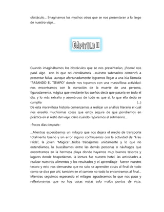 El resumen describe un viaje submarino educativo donde varias tropas aprenden sobre diferentes temas a través de lecturas, actividades y discusiones. La tropa descubre textos en una botella que contienen información sobre cohesión y referencias. Más adelante leen "La Abuela Pintora" y realizan actividades para reflexionar sobre el amor. Su objetivo es mejorar la comprensión lectora antes de terminar el viaje.