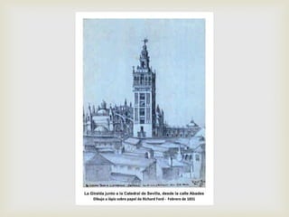 Este documento describe a los viajeros románticos Richard Ford y Washington Irving que visitaron España en el siglo XIX, atraídos por el exotismo del país. Richard Ford realizó más de 500 dibujos y publicó una guía de viaje influyente sobre España. Washington Irving quedó fascinado por la Alhambra y escribió sus famosos "Cuentos de la Alhambra", creando una ruta turística que aún es popular. Ambos ayudaron a crear una imagen estereotipada de España que perduró.