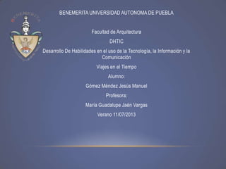 Este documento describe los conceptos científicos relacionados con los viajes en el tiempo, incluyendo la teoría de la relatividad de Einstein, agujeros negros, y agujeros de gusano. Aunque los viajes en el tiempo siguen siendo teóricos, este documento explora cómo objetos como agujeros negros y agujeros de gusano podrían, en teoría, conectar diferentes puntos del espacio-tiempo. El documento también discute paradojas como la paradoja de consistencia que surgen de la posibilidad de viajar al pas