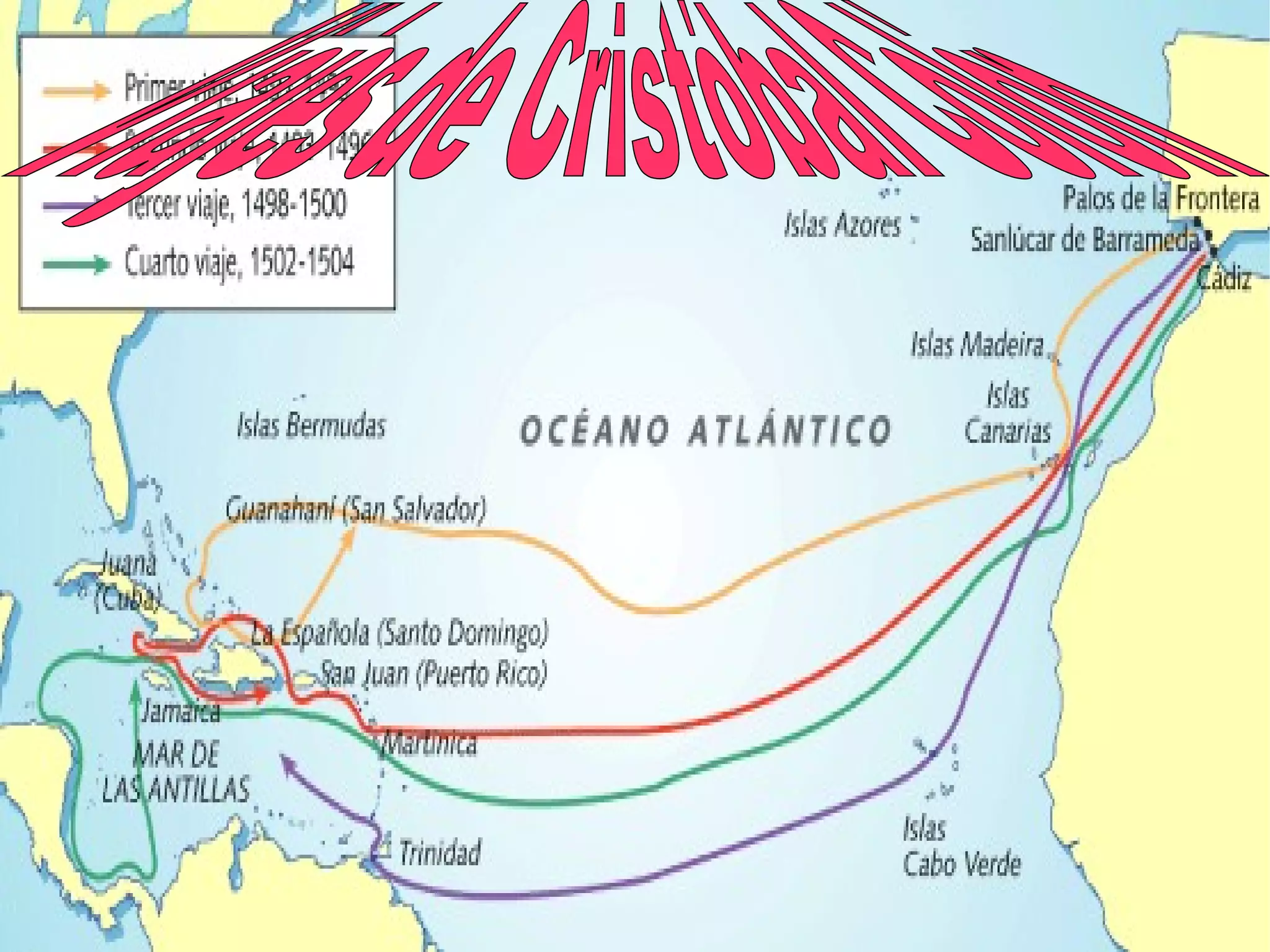 Cristóbal Colón realizó cuatro viajes a América entre 1492 y 1506, descubriendo las Américas para Europa sin saber que había encontrado un nuevo continente. Aunque su objetivo era encontrar una ruta a Asia navegando hacia el oeste, sus viajes resultaron en la colonización europea de las Américas y el comienzo del intercambio de personas y culturas entre los dos hemisferios.