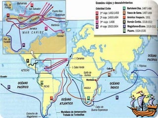 En el siglo XV, los imperios coloniales europeos como España, Portugal, Holanda e Inglaterra surgieron debido a los descubrimientos geográficos. Portugal lideró la expansión europea a partir de 1419 cuando descubrió las islas Madeira, luego las Azores y Cabo Verde, llegando a la India en 1498 bajo Vasco de Gama. España también se expandió cuando patrocinó el viaje de Cristóbal Colón en 1492, quien descubrió las Bahamas, Cuba y Hispaniola, consolidando el dominio español en América