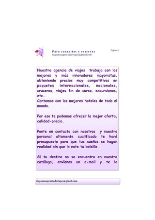 Este documento presenta una agencia de viajes que ofrece paquetes turísticos a destinos internacionales como el Caribe, Ámsterdam, Tailandia, Estados Unidos y más. Proporciona información sobre hoteles como el Hotel Oasis Cancún, Hotel Paradisus Cancún y Omni Cancún Hotel & Villas en el Caribe, así como el Hotel Park Plaza Victoria, NH Ámsterdam Barbizon Palace y Eden Hotel Ámsterdam-Hampshire Eden en Ámsterdam. La agencia ofrece precios competitivos en vuelos, hoteles y paquetes completos.