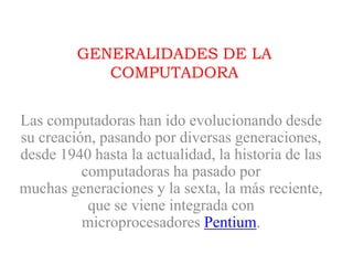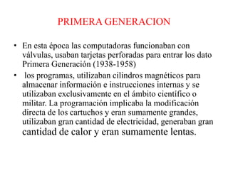 El documento resume las diferentes generaciones de computadoras desde la primera hasta la sexta. La primera generación utilizaba válvulas y tarjetas perforadas. La segunda generación introdujo los transistores. La tercera generación utilizó circuitos integrados. La cuarta generación desarrolló los microprocesadores. La quinta generación trajo las computadoras personales. Cada generación redujo el tamaño de las computadoras y mejoró la velocidad y confiabilidad.