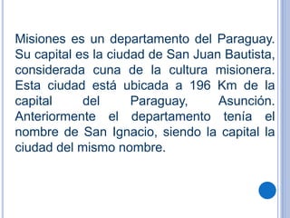 Misiones es un departamento del este de Paraguay cuya capital es San Juan Bautista. Se formó en el siglo XVIII cuando los jesuitas establecieron misiones en la zona para evangelizar a la población local. La economía del departamento se basa principalmente en la ganadería, aunque también se cultiva arroz, maíz, naranjas y otros productos. Misiones limita con los departamentos de Paraguarí, Caazapá e Itapúa, y con la provincia argentina de Corrientes.