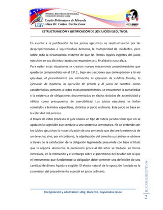 Este documento describe los juicios ejecutivos en Venezuela. Explica las condiciones para recurrir a la vía ejecutiva, como la existencia de una obligación de pago líquida con un título ejecutivo como documento público o privado reconocido. También cubre los procesos paralelos de la vía ejecutiva y la diferencia con otros procedimientos.