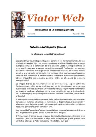 El Superior General habla sobre la Iglesia como una comunidad "samaritana" que acoge a todos sin juzgar. Describe las actitudes fundamentales de escuchar, establecer diálogos y dejar actuar al Espíritu Santo. El mensaje del Sínodo invita a la humildad, disponibilidad y conversión. Se anuncian varios eventos y reuniones próximos. Finalmente, varios Viatorianos comparten sus convicciones sobre la importancia de la educación y la transmisión de la fe.
