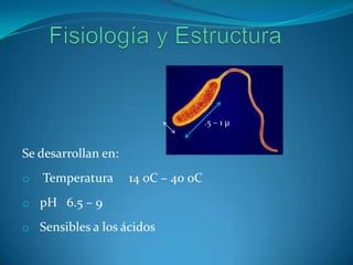 Este resumen describe la familia Vibrionaceae. Son bacilos Gram-negativos móviles con un flagelo polar que crecen entre 14-40°C y a pH entre 6.5-9. Incluyen el género Vibrio que causa el cólera. El cólera se transmite por agua o alimentos contaminados y causa diarrea acuosa severa que puede conducir a deshidratación y muerte si no se trata. El tratamiento incluye rehidratación oral o intravenosa y antibióticos como la tetraciclina