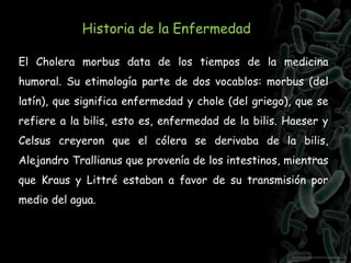 El documento proporciona información sobre la enfermedad del cólera. Explica que es causada por la bacteria Vibrio cholerae, la cual se transmite principalmente por la ingestión de agua y alimentos contaminados con heces o vómito de personas infectadas. Describe los síntomas, tratamiento, población susceptible, prevención y breve historia de brotes de cólera en Honduras desde 1991.