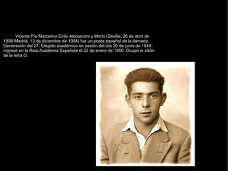 Vicente Aleixandre fue un poeta español de la Generación del 27 que publicó su primer libro Ámbito en 1928. Fue elegido miembro de la Real Academia Española en 1949. A pesar de sus ideas izquierdistas, permaneció en España después de la guerra civil y se convirtió en maestro de los jóvenes poetas. En sus últimos libros, la experiencia de la vejez y la cercanía de la muerte le llevaron de vuelta a un estilo más irracionalista y depurado.