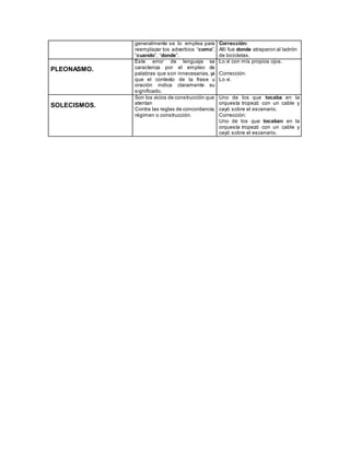 Este documento define y proporciona ejemplos de diferentes vicios del lenguaje como la anfibología, el barbarismo, la cacofonía, la pobreza, la monotonía, los metaplasmos, los neologismos, el adequeísmo, el dequeísmo, el queísmo, el pleonasmo y los solecismos. Explica que estos errores consisten en ambigüedades, uso incorrecto de palabras, repetición de sonidos desagradables, falta de vocabulario, repetición de frases, cambios en fonemas o grafemas, omis