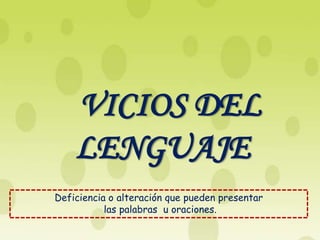 El documento describe los principales vicios del lenguaje, incluyendo la ambigüedad, la impropiedad léxica, la vaguedad léxica, la cacofonía, la redundancia y el barbarismo. Estos vicios consisten en deficiencias o alteraciones en el uso de palabras u oraciones que pueden dar lugar a interpretaciones múltiples, uso inapropiado de términos, expresiones vagas, efectos sonoros desagradables, frases redundantes y uso incorrecto de vocablos. El documento proporciona ejemplos de cada vicio para