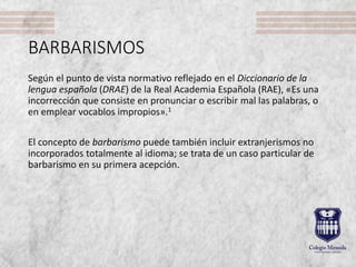 El documento describe diferentes tipos de vicios del lenguaje como barbarismos (palabras mal pronunciadas o escritas), marcas comerciales usadas como sustantivos comunes, anglicismos, solecismos (falta de concordancia), ambigüedad, redundancia, preposiciones mal empleadas, dequeísmo y vaguedad. Define cada uno de estos conceptos y proporciona ejemplos.