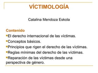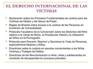 Este documento presenta conceptos básicos sobre la victimología. Define términos clave como víctima, victimización primaria, secundaria y reiterada. Explica las causas de vulnerabilidad como edad, discapacidad, género y privación de libertad. También describe los principios que rigen el derecho de las víctimas como la no discriminación, dignidad, protección e interés superior del niño. Finalmente, resume los derechos de las víctimas como el derecho a un trato digno y comprensivo, protección contra la