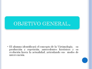 Este documento presenta ideas sobre los precursores de la victimología, mencionando a tres de ellos: Mendelshom, Von Hentig y Drapkin. Explica algunas de las ideas y clasificaciones que propusieron sobre la víctima, como factores de riesgo y grados de culpabilidad. También define conceptos clave de la victimología como víctima, victimario, victimización y factores victimógenos.
