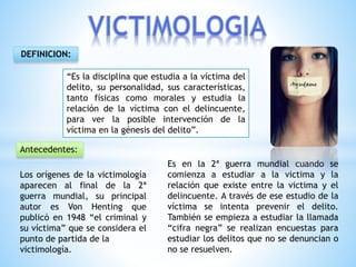 Este documento define la victimología como la disciplina que estudia a la víctima del delito, su personalidad y características, así como su relación con el delincuente. Se originó después de la Segunda Guerra Mundial para prevenir delitos mediante el estudio de las víctimas. Clasifica a las víctimas en no participantes e ideales, accidentales e indiscriminadas; y participantes como omisivas, voluntarias, provocadoras y simbólicas. También describe víctimas familiares, colectivas y especialmente vulnerables
